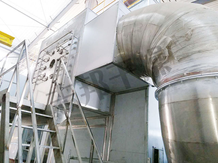 臥式噴霧干燥設(shè)備可使溶液、乳濁液、懸浮液、糊狀液等物料,經(jīng)噴霧干燥成為干燥粉末狀、細(xì)中顆粒的制品。其工作原理如下:空氣通過過濾器和加熱裝置后,進(jìn)入干燥室頂部的熱風(fēng)分配器,通過熱風(fēng)分配器的熱空氣均勻地進(jìn)入干燥室,并成螺旋狀流動(dòng),同時(shí)將料液送到安裝在干燥室頂部的離心噴霧頭,料液被霧化成小的霧狀液滴,使料液和熱空氣接觸的表面積大大增加,水分迅速蒸發(fā),在短的時(shí)間內(nèi)形成干燥成品。